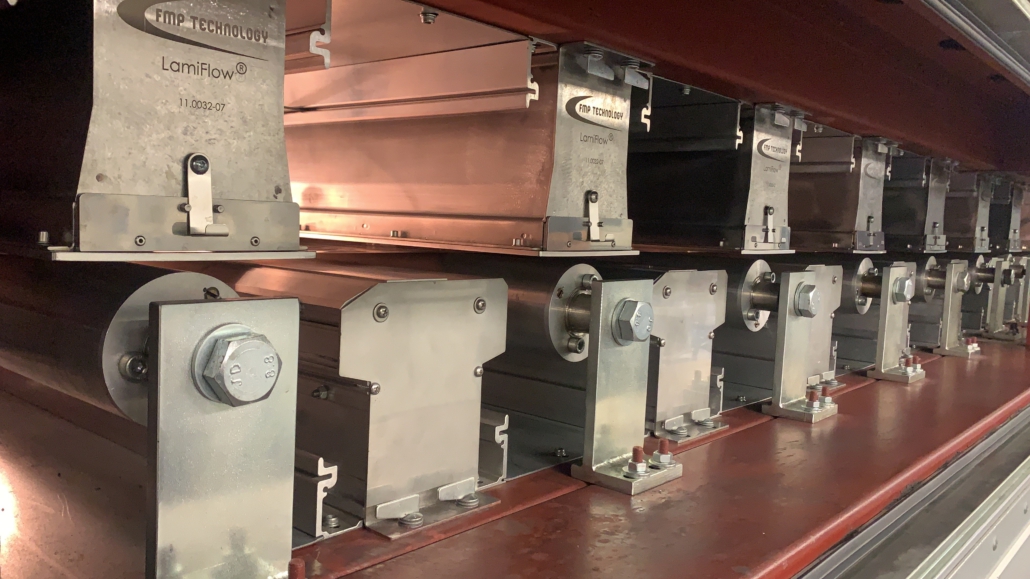 Die Kernkomponenten im Bereich der Beschichtung und Trocknung sind unsere präzise FMP Breitschlitzdüse und unsere bewährte und patentierte FMP LamiFlow Trocknerdüse. Dies garantiert eine einwandfreie und hochpräzise Beschichtung mit anschließender absolut gleichmäßiger, schneller und exzellenter Trocknung. Darüber hinaus verfügt die Anlage über zusätzliche Schutzfolienwickler, ein Bahnmarkierungssystem zur Rückverfolgbarkeit und umfangreiche Inspektionssysteme, wie z.B. ein Inline-Röntgenfluoreszenzmessgerät zur Katalysatorerkennung und ein hochauflösendes Kamerasystem mit automatischer Bildanalyse zur Prozessüberwachung.